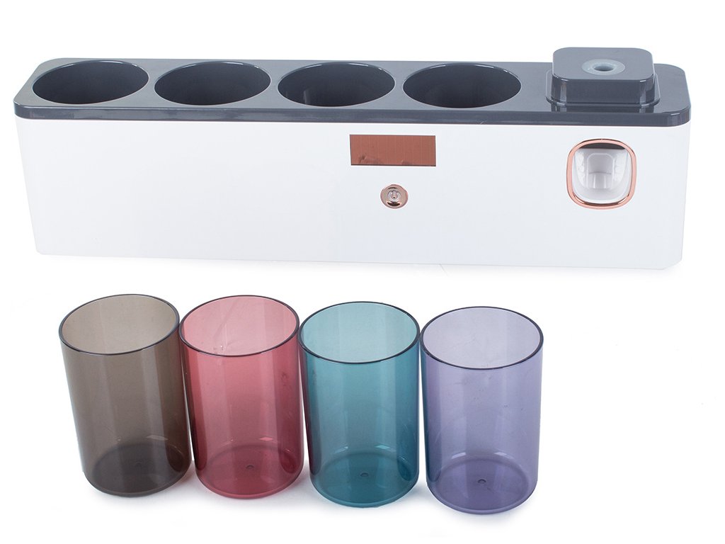 Súčasťou organizéra je dávkovač zubnej pasty a 4 plastové poháriky s objemom 300 ml.