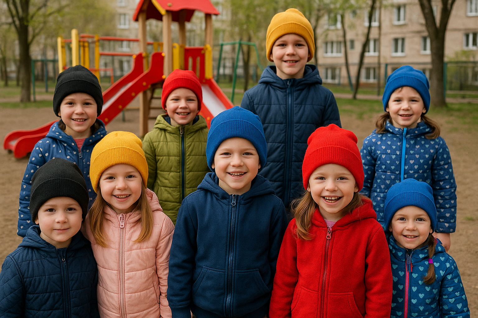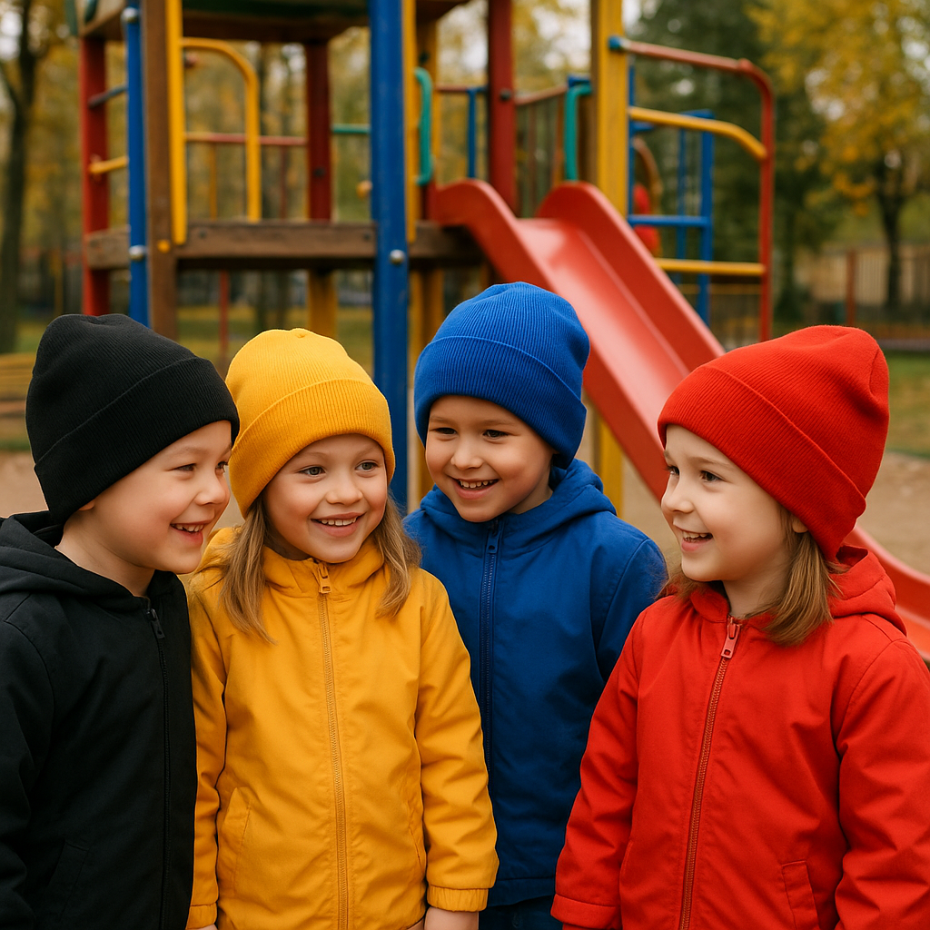 Jednotné čiapky vytvárajú pocit spolupatričnosti, poriadku a bezpečia. Deti sa v nich cítia výnimočne – akoby mali svoju malú školskú „rovnošatu“.